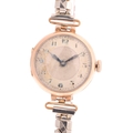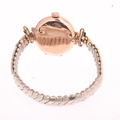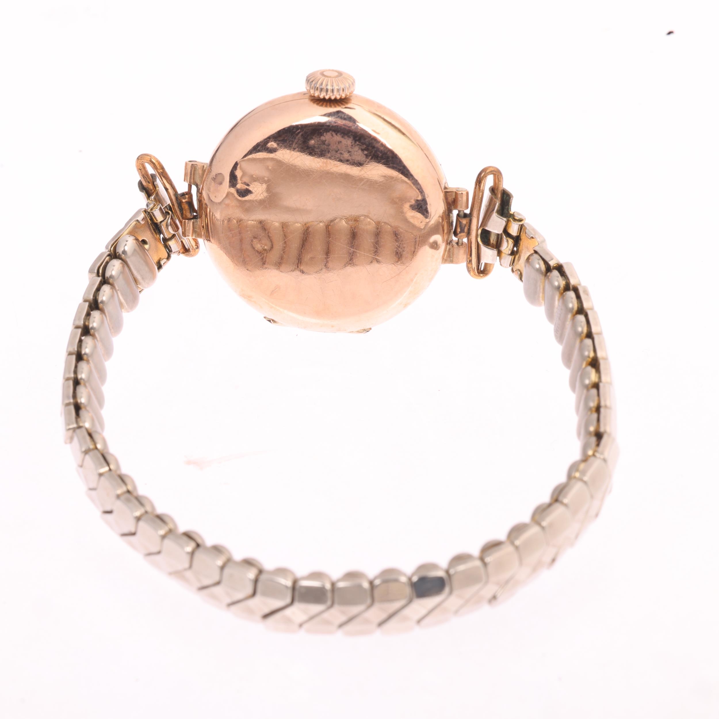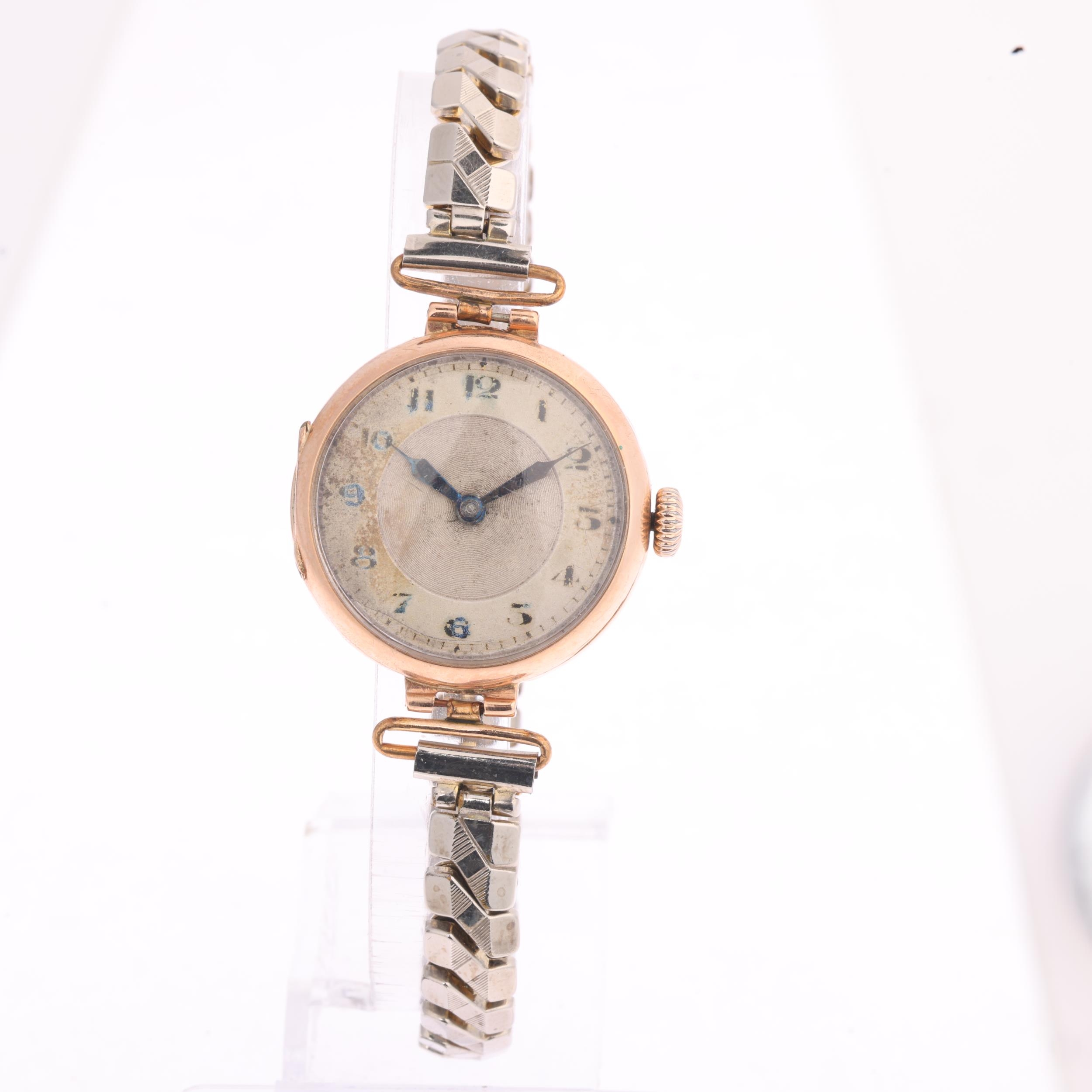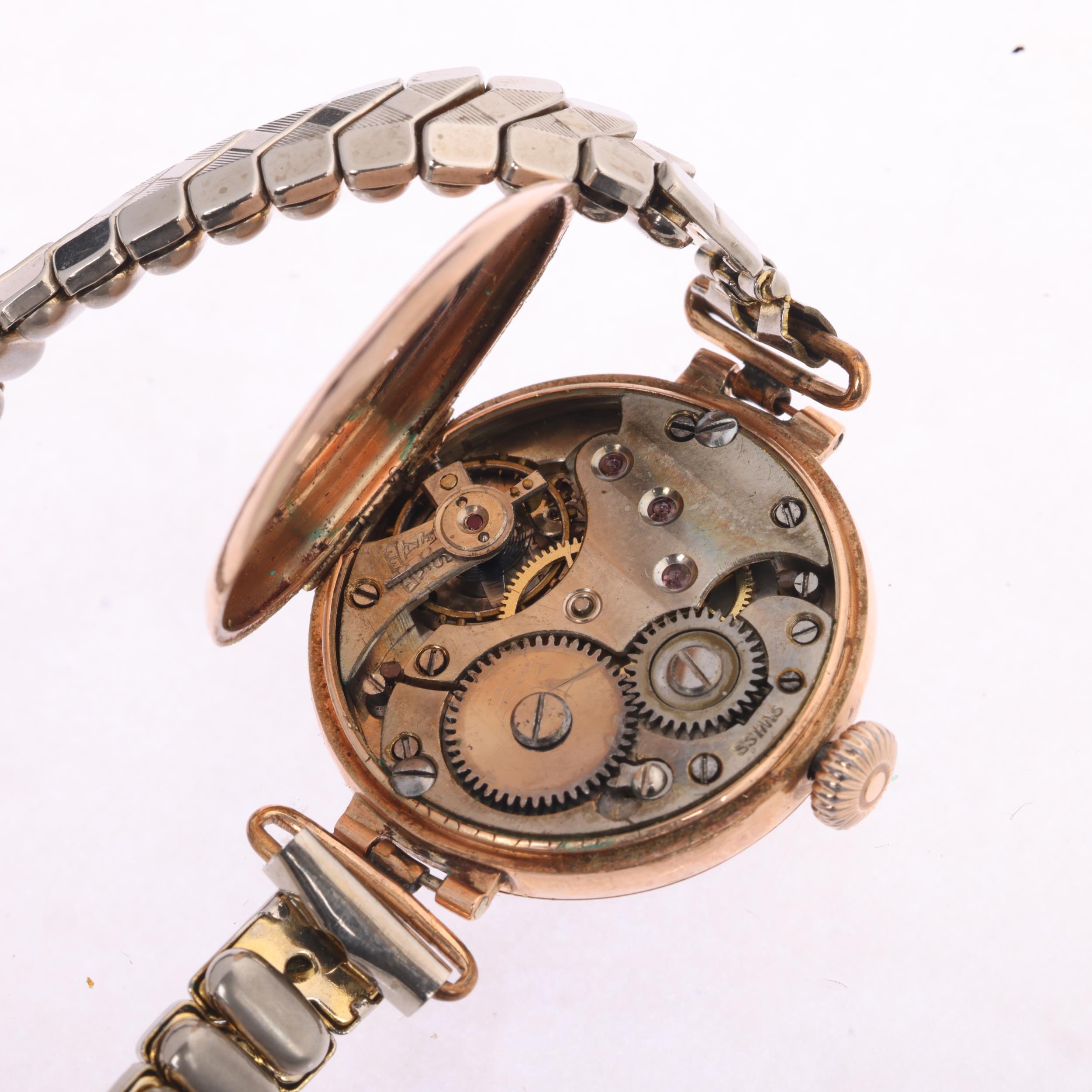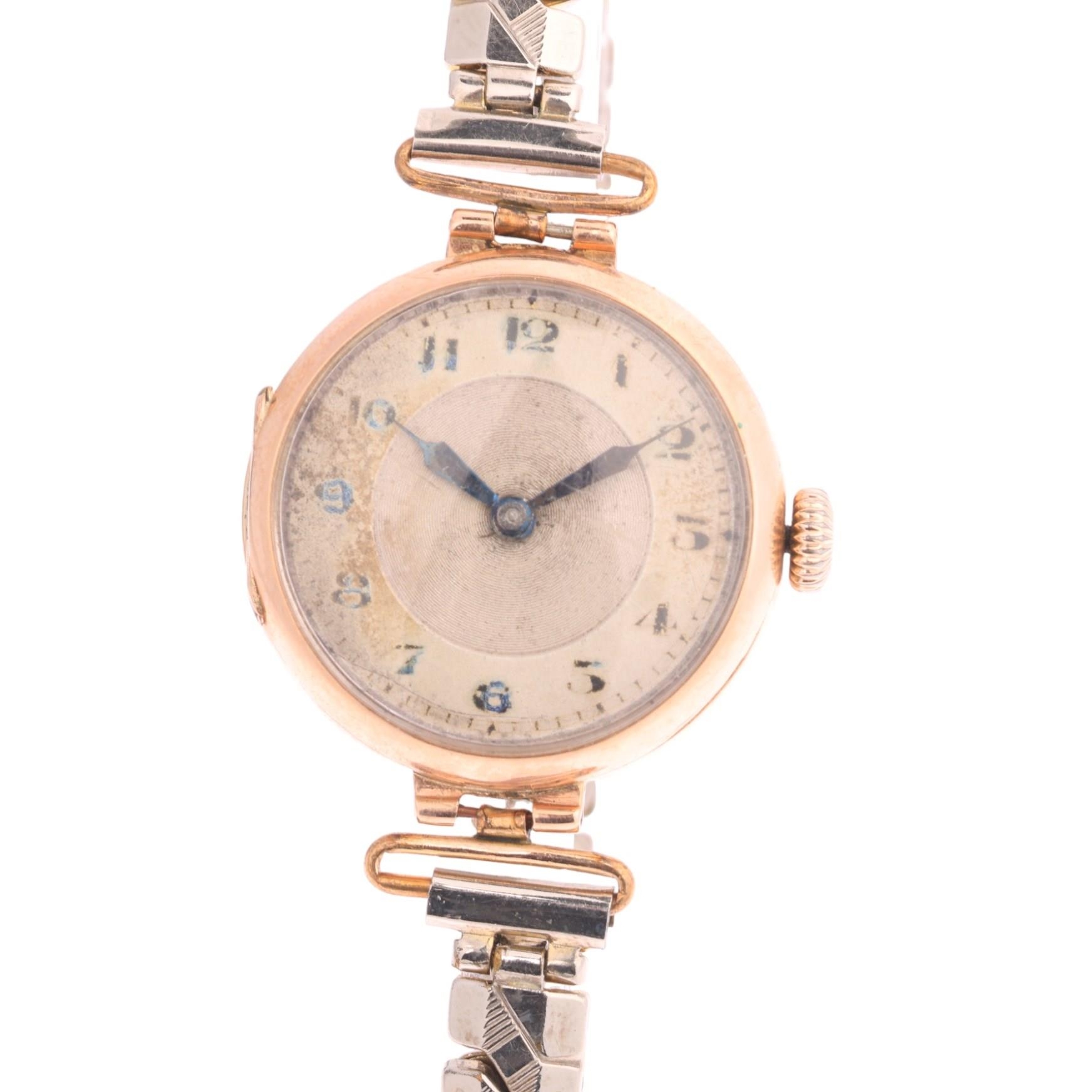 A 9ct rose gold Officer's style trench mechanical wristwatch, silvered dial with black Arabic numerals, blued steel syringe hands and gold plated expanding bracelet, import hallmarks London 1919, case no. 56815, case width 26mm, 23.4g gross, not currently working