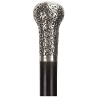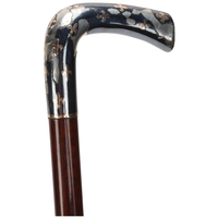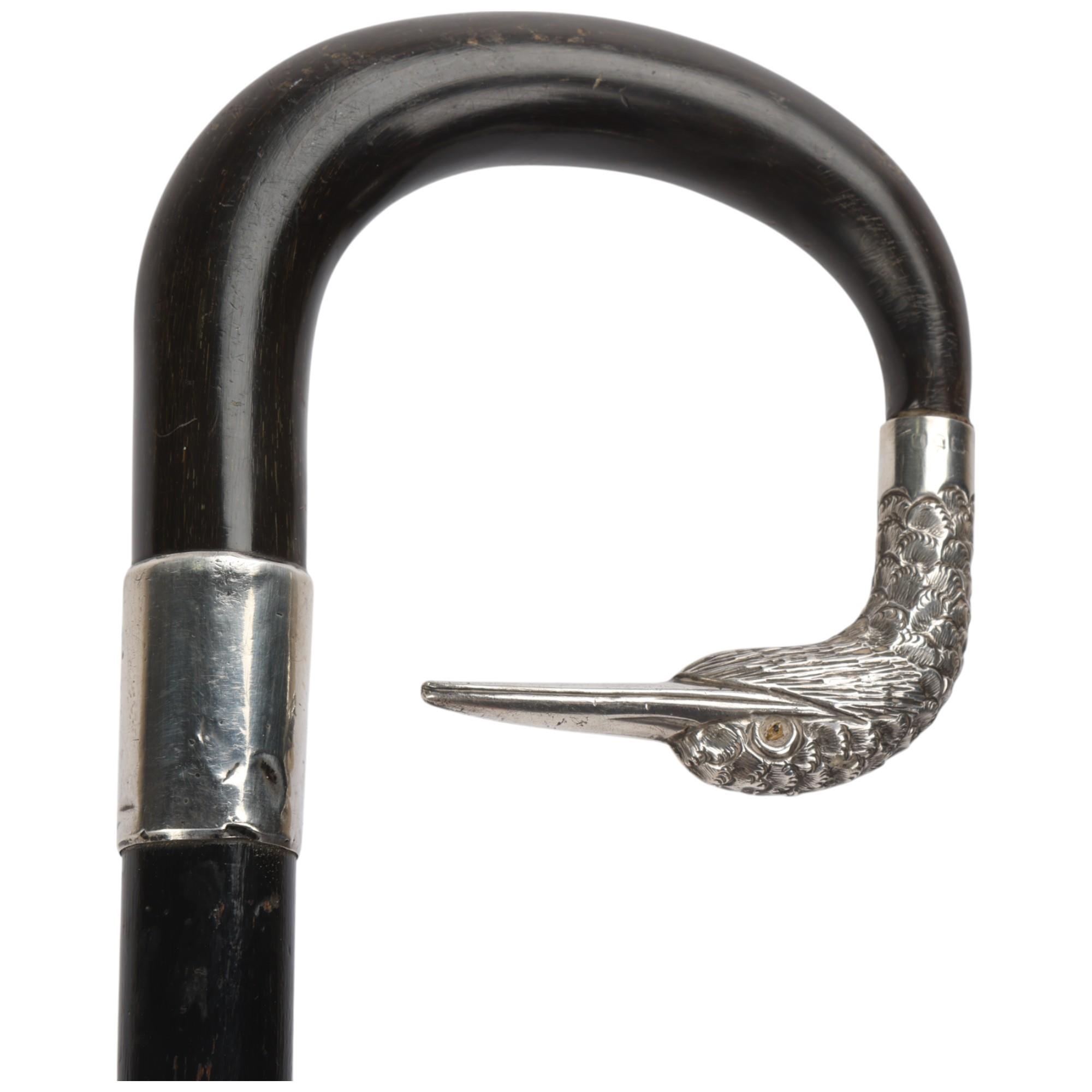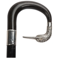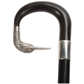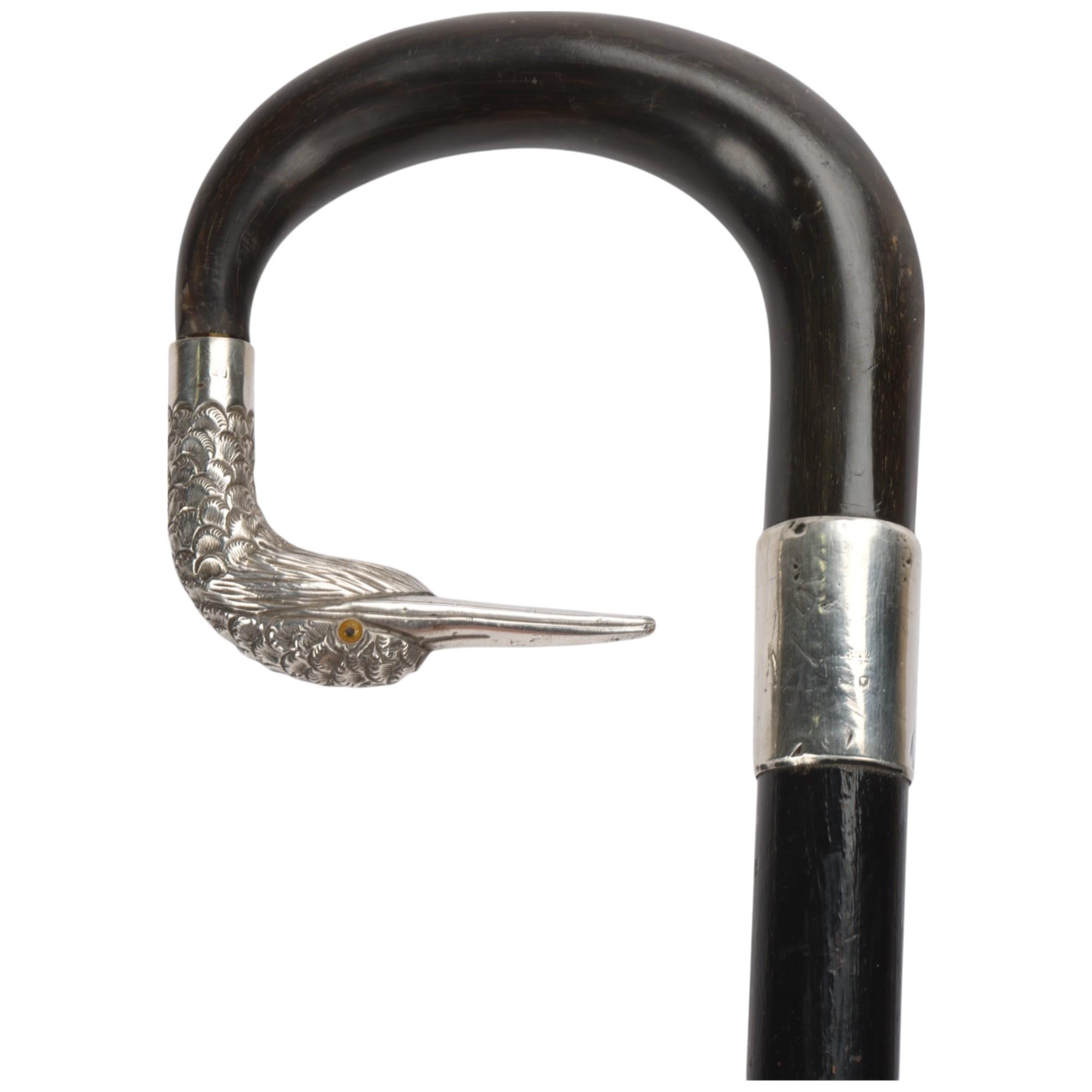 An ebony and horn-mounted walking cane, with silver duck head terminal and glass eyes, hallmarks London 1924