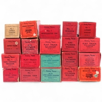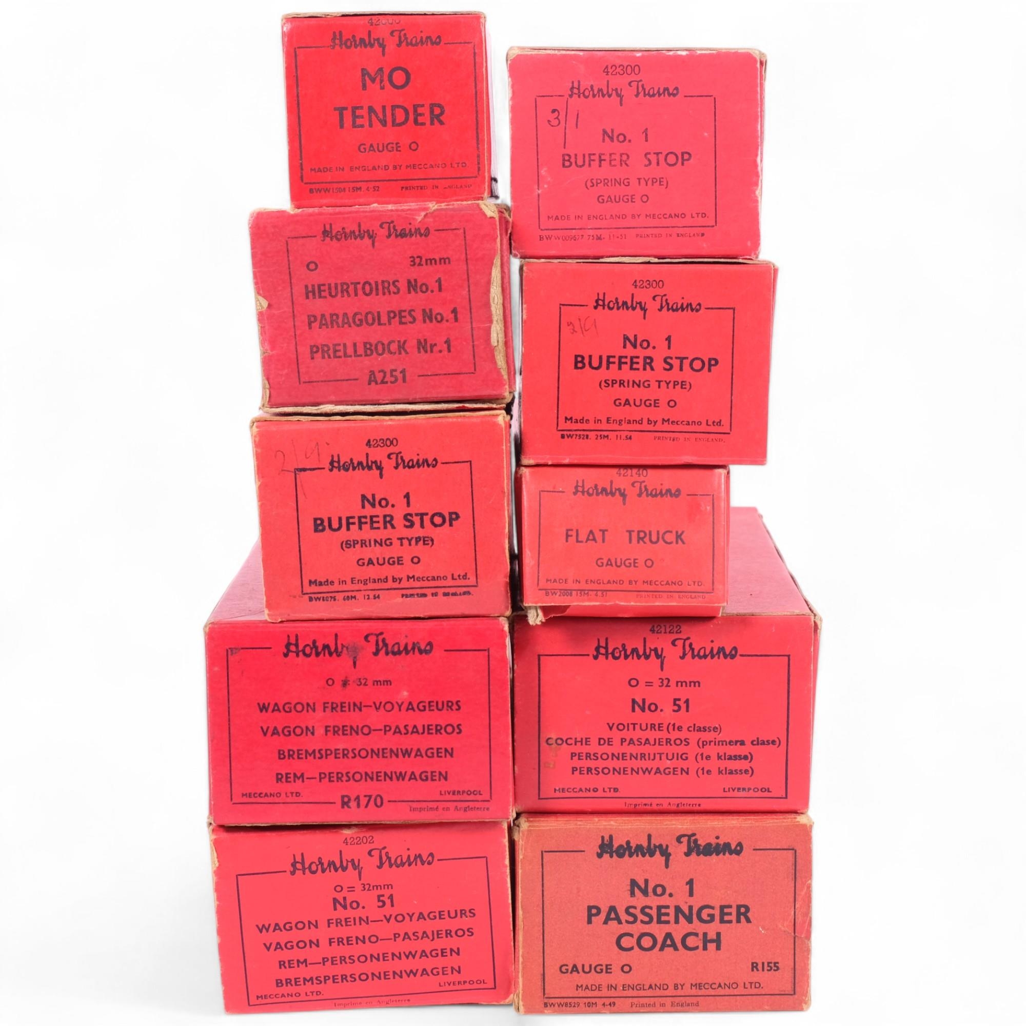 A selection of 10 various O gauge boxed wagons and buffer stops, examples including a mo tender, no. 1 buffer stops, no. 1 passenger coach, etc