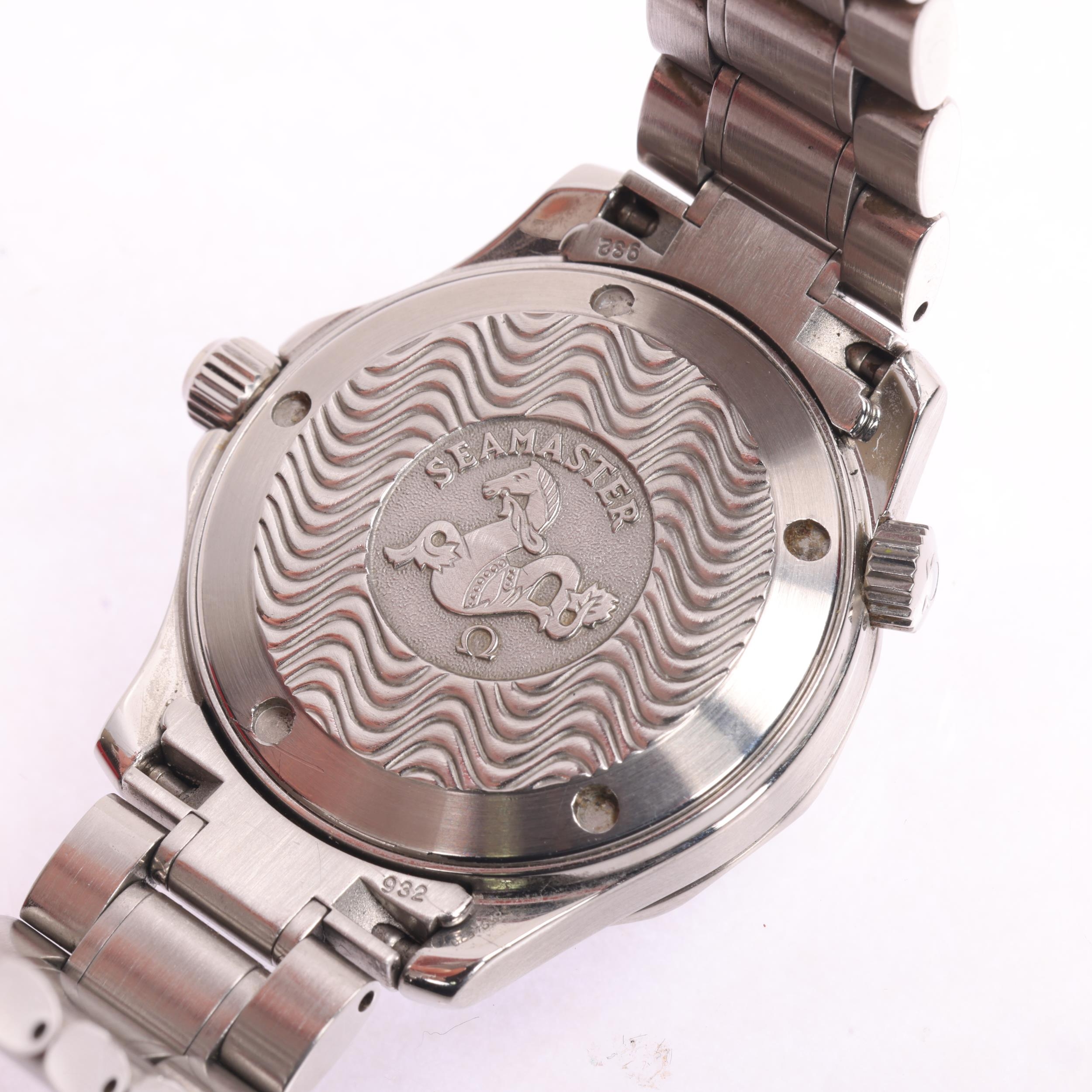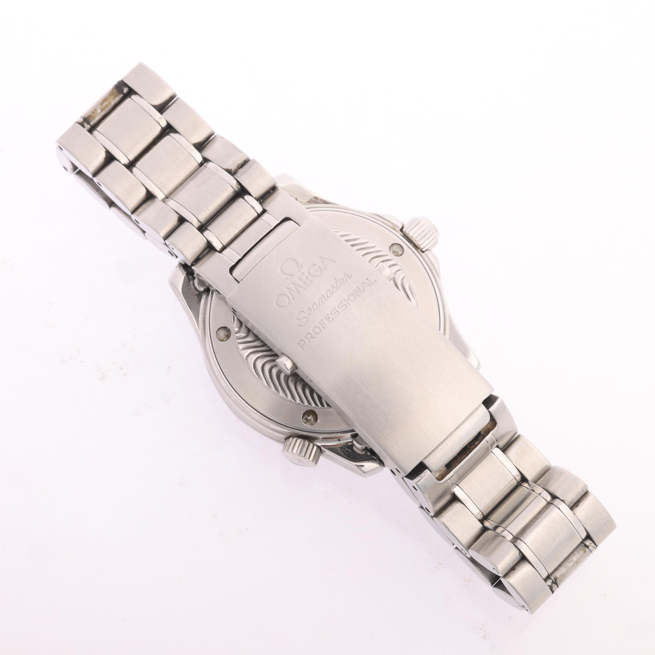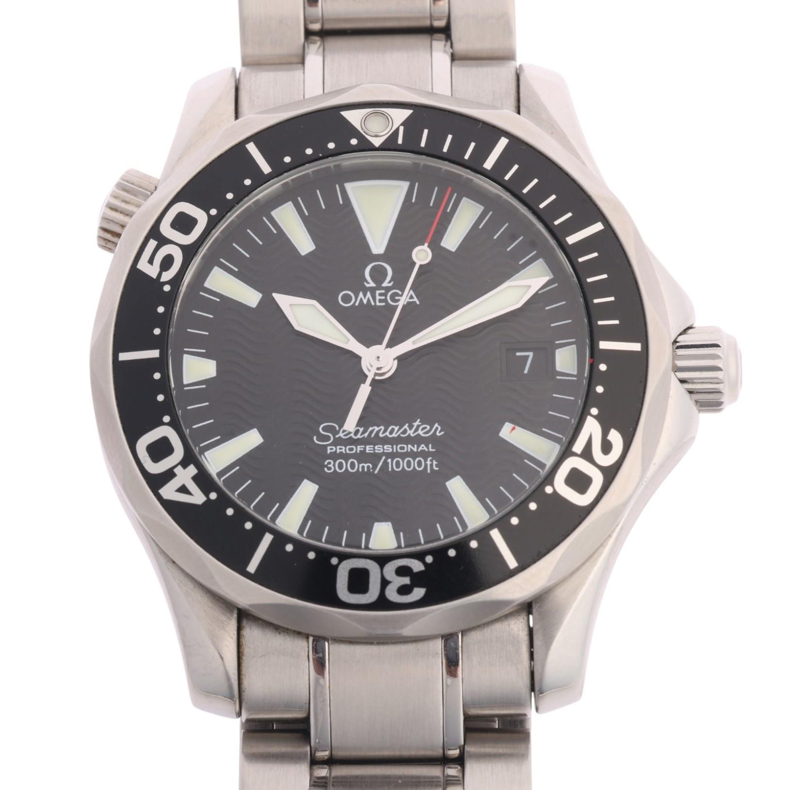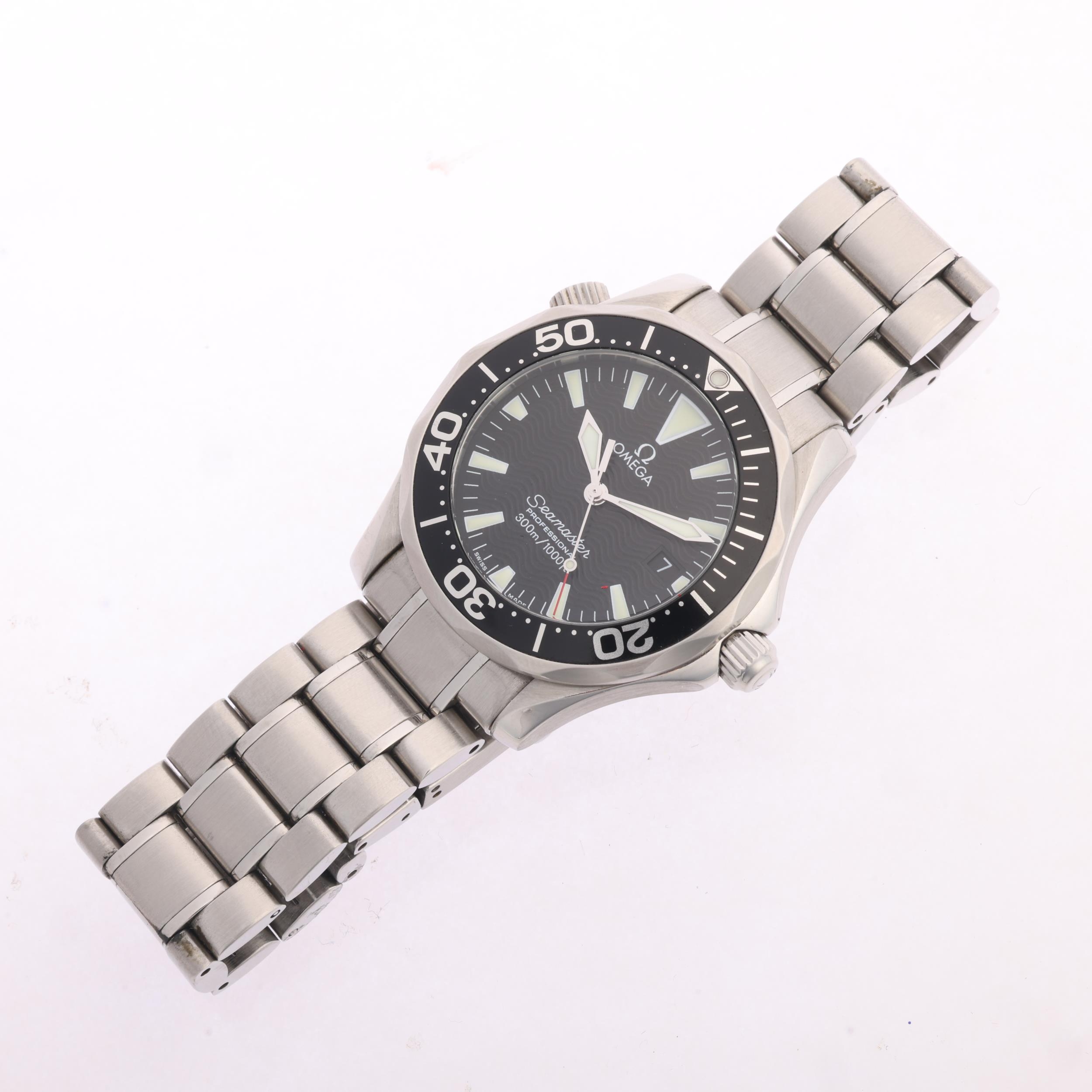 OMEGA - a stainless steel Seamaster Professional 300M quartz calendar bracelet watch, ref. 196.1641, circa 1998, black wave dial with luminous tapered baton hour markers, sword hands with luminous inserts, sweep centre seconds hand, date aperture and black rotating bezel, 6 jewel movement with calibre 1538, serial no. 58994520, case width 36mm, working order, boxed with Watches Of Switzerland pre-owned guarantee card